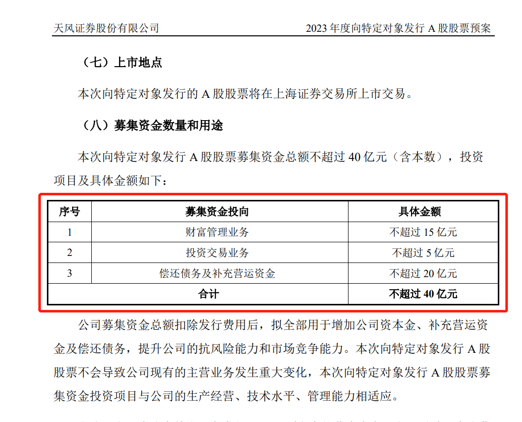 根据定增预案,天风证券定增不超过40亿元。在资金用途方面,其中,偿还债务补充营运资金不超过20亿元、财富管理业务不超过15亿元以及投资交易业务不超过5亿元。