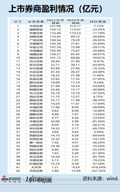 近日,42家纯证券业务A股券商全部披露了2022年年报。wind数据显示,42家券商2022年合计实现营业收入4888.64亿元,同比下降23.55%;合计实现归母净利润1266.94亿元,同比下降33.66%。