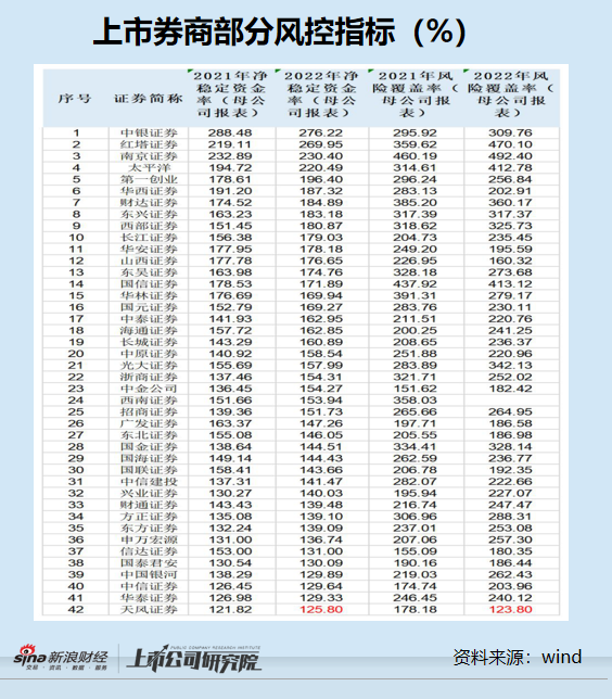 天风证券不仅巨亏,而且流动性风险加剧。2022年,天风证券净稳定资金率为125.8%,在42家券商中垫底,也是连续第二年垫底;风险覆盖率为123.8%,较2021年大幅下降54.38个百分点,同样垫底。