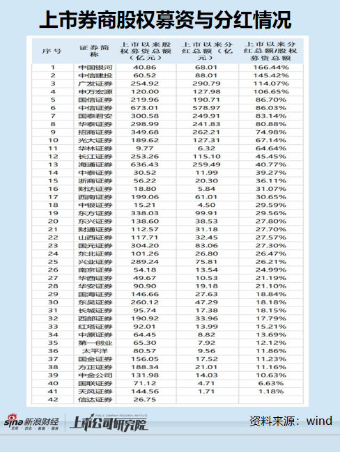 wind数据显示,上市以来分红总额占股权募资总额比例超过100%的有四家券商,分别是中国银河、中信建投、广发证券、申万宏源,比例分别为166.44%、145.42%、114.07%、106.65%,与天风证券1.18%的比例天差地别。
