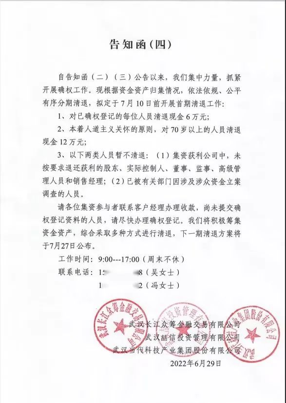 6月29日,《告知函》(四)发布,称7月10日前开展首期清退工作,对已确权登记的每位人员清退现金6万元;本着人道主义关怀的原则,对70岁以上的人员清退现金12万元。