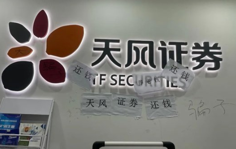 近日,有网友爆料,天风证券江苏分公司人去楼空,爆料图片中,天风证券的前台被贴满了“骗子”“还我养老钱”等字样。