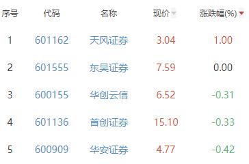 其中,天风证券、东吴证券、华创云信、首创证券、华安证券位列板块涨幅前五位,涨幅分别为1.00%、0.00%、-0.31%、-0.33%、-0.42%。
