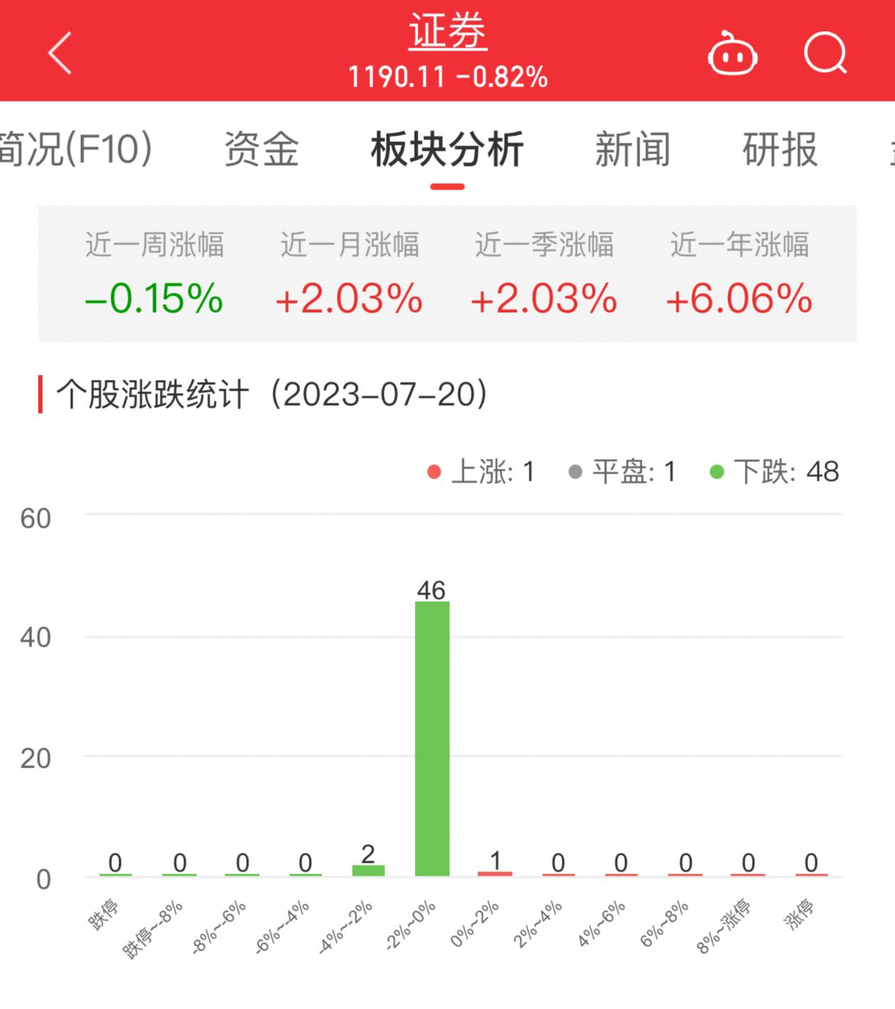 今日,证券板块整体跌幅0.82%,其中1只股票上涨,1至股票篇平盘,48只股票下跌。