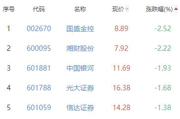 国盛金控、中国银河、光大证券、信达证券位列涨幅榜后五位,涨幅分别为-2.52%、-1.93%、-1.68%、-1.38%。