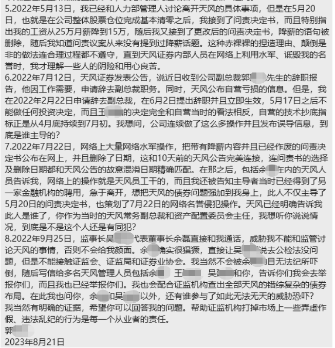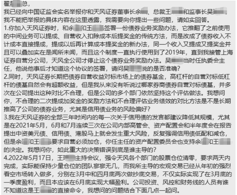 刚刚网上传出来前任高管郭XX对天风证券其他高管的举报。详细的举报内容他已经给证监会,这里举报人只是提出了问题,让回答!