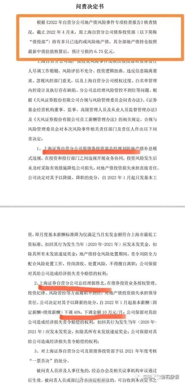 因亏损严重,天风证券对原债券投资部总经理刘防和总经理郭胜北作出处罚。对刘防予以降级、降职处分、取消奖金等处罚;对郭胜北予以基本薪酬下调40%、扣除奖金,保留对公司损失责令赔偿的权利等处罚;对上海证券自营分公司及原债券投资部予以2021年年度考核“一票否决”的处分。