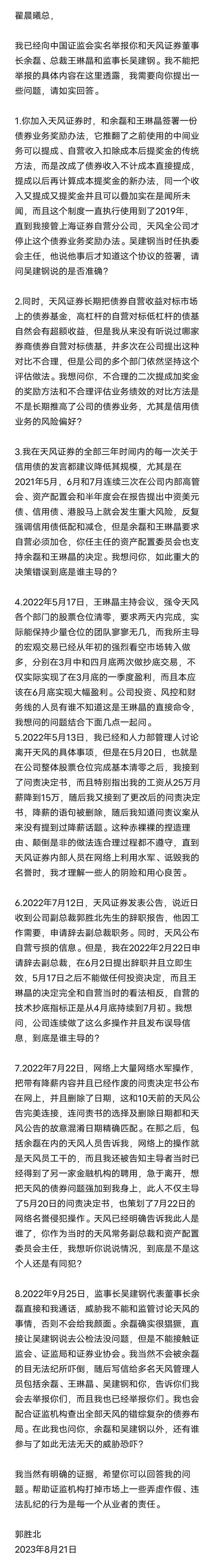 根据内容,原天风证券副总裁郭胜北在网络上发表了一篇文章,八问翟晨曦及老东家,并表示已经向中国证监会实名举报原天风证券常务副总裁翟晨曦、天风证券董事长余磊、总裁王琳晶和监事长吴建钢。
