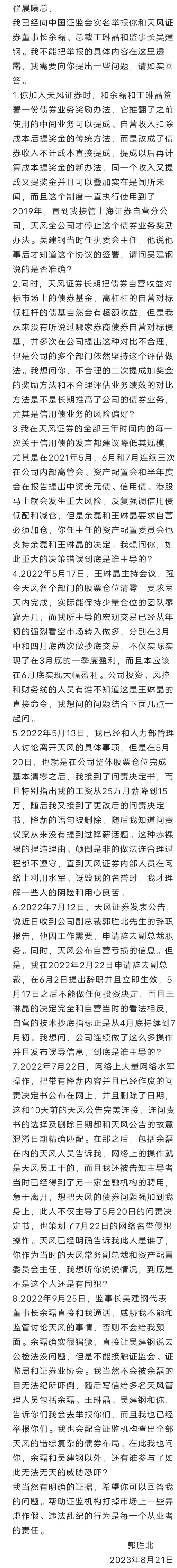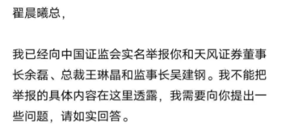 8月21日下午,社交平台流传“郭胜北八问天风证券原常务副总裁翟晨曦的声讨信(以下简称《声讨信》,并表示已向证监会实名举报天风证券董事长余磊、总裁王琳晶和监事长吴建钢。”