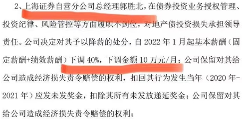 郭胜北被指在债券投资业务授权管理、投资纪律、风险管控等方面履职不到位,对地产债投资损失承担领导责任,其薪酬被下调40%(月薪25万降到15万),并扣除所有未发放递延奖金。