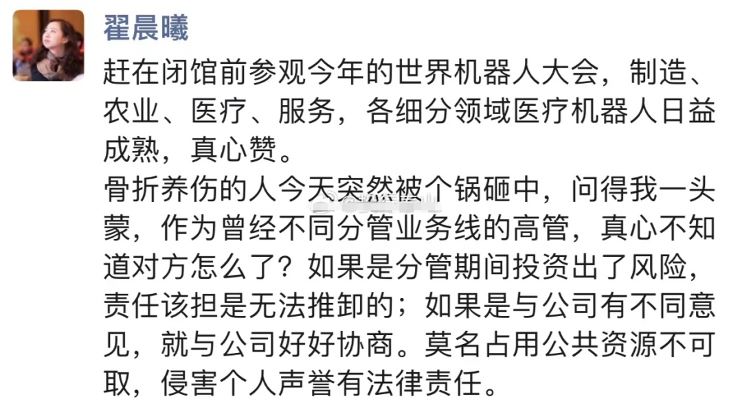 对此,8月22日,有大V在社交平台晒出疑似翟晨曦的回应截图,“骨折养伤的人今天突然被个锅砸中,问得我一头蒙,作为曾经不同分管业务线的高管,真心不知道对方怎么了?如果是分管期间投资出了风险责任该担是无法推卸的;如果是与公司有不同意见,就与公司好好协商。莫名占用公共资源不可取,侵害个人声誉有法律责任。”