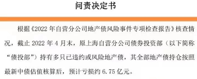 《问责书》显示,截至2022年4月末,天风证券原上海自营分公司债券投资部持有多只已违约或风险地产债,预计亏损约6.75亿元。
