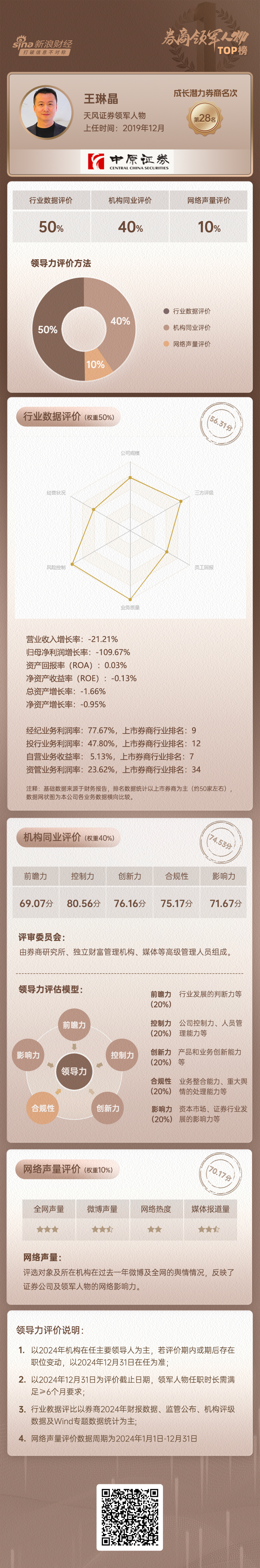 2024年,王琳晶先生领导下的天风证券综合评分位于成长发展券商第28名,而其中行业数据评价分数为行业垫底。分维度来看: