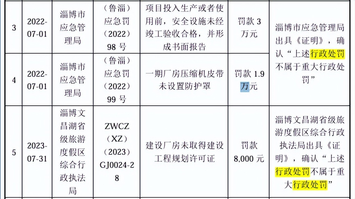 报告期内,公司存在下列6项行政处罚。特别是2022年7月18日进行的两次工伤合并处罚,2018年12月7日,公司西中频炉车间发生一起工伤事故,且因该事故造成1人死亡。公司未认真落实企业安全生产主体责任,未认真做好生产设备管理,为职工提供不符合行业标准的劳动防护用品,安全风险和隐患分级管控措施落实不到位,未按规定及时上报事故,还有一次是2019年1月18日工伤,淄博文昌湖省级旅游度假区管理委员会对其合计罚款190万元。