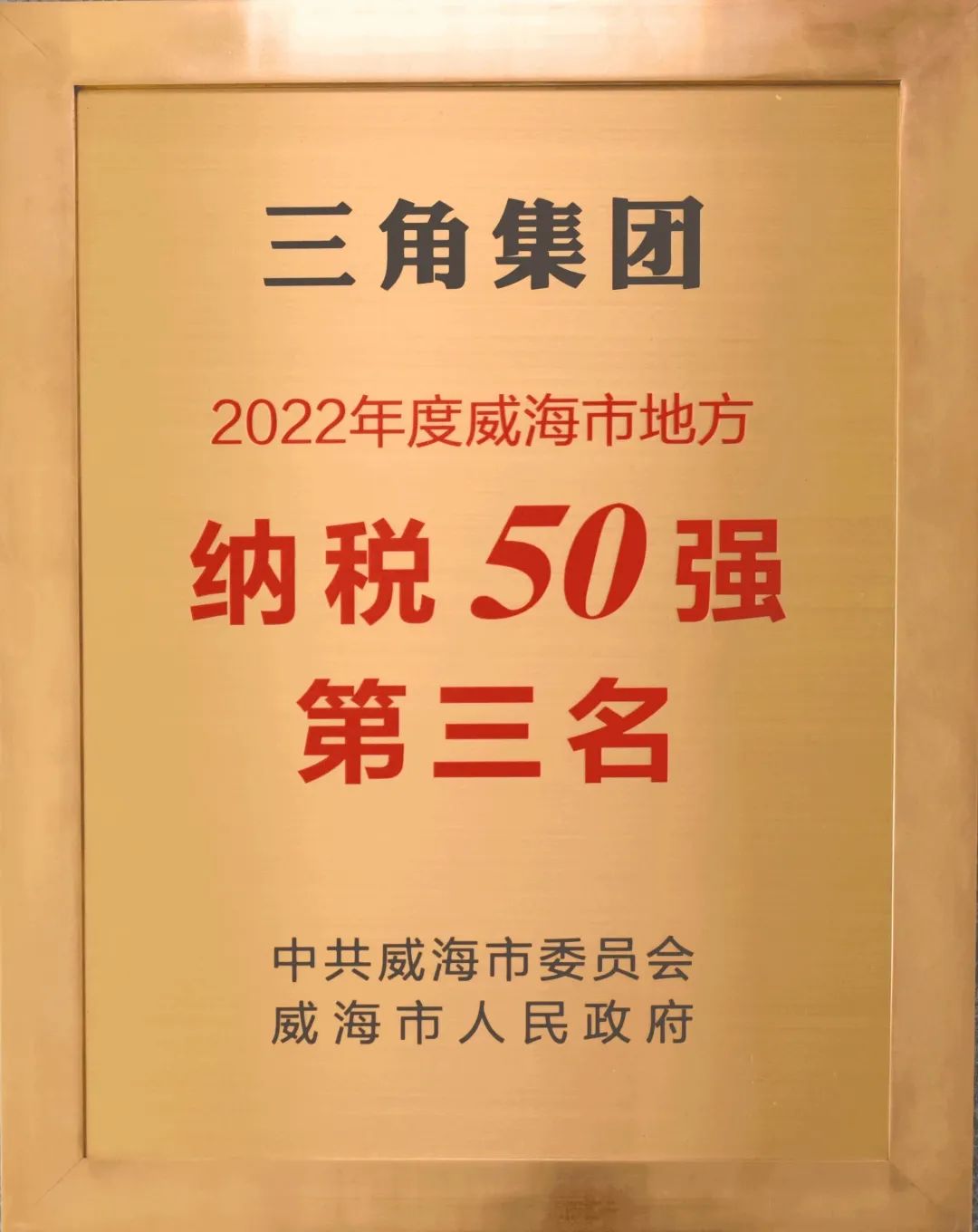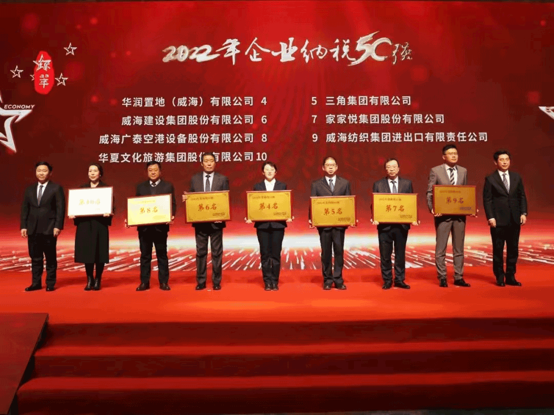 1月29日,在环翠区“区委经济工作会议暨2023年工作动员大会”上,三角集团有限公司上榜“2022年度纳税50强”。