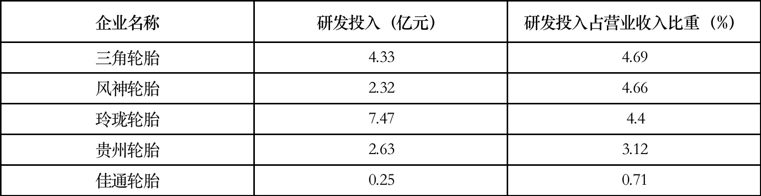 ——人才结构比较合理。目前三角轮胎有889名研发人员,研发人员数量占公司总人数的比例为15.62%(见表2),其中,博士研究生5人、硕士研究生46人、本科285人、专科 235人、高中及以下318人,高层次人才占比5.74%。在与“轮胎”赛道的对比中,三角轮胎的研发人员占比排名第一,高层次研发人才比重也仅次于玲珑轮胎(6.15%)。可见,三角轮胎较为重视对于研发人才尤其是高层次研发人才的吸纳与培育,为企业的创新发展提高了良好的人才基础。