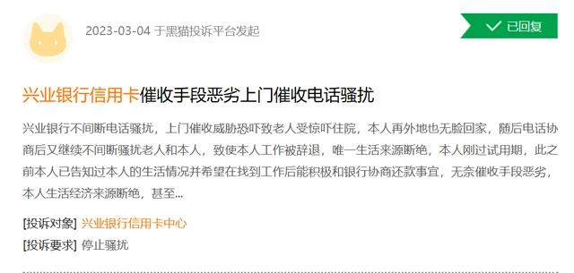 一位用户投诉称,兴业银行不间断电话骚扰,上门催收威胁恐吓致老人受惊吓住院,本人再外地也无脸回家,随后电话协商后又继续不间断骚扰老人和本人,致使本人工作被辞退,唯一生活来源断绝,本人刚过试用期,此之前本人已告知过本人的生活情况并希望在找到工作后能积极和银行协商还款事宜,无奈催收手段恶劣……