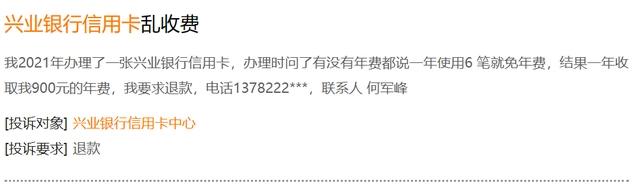 还有用户投诉兴业信用卡乱收费。有用户投诉称,“我2021年办理了一张兴业银行信用卡,办理时问了有没有年费都说一年使用6 笔就免年费,结果一年收取我900元的年费……”
