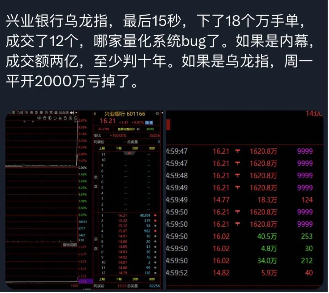 逐笔交易明细显示,当天收盘前最后15秒下单18个万手单,成交了12个。业内人士推断称,有可能“是哪家量化系统bug了?如果是内幕消息,成交额2亿,至少判十年。”