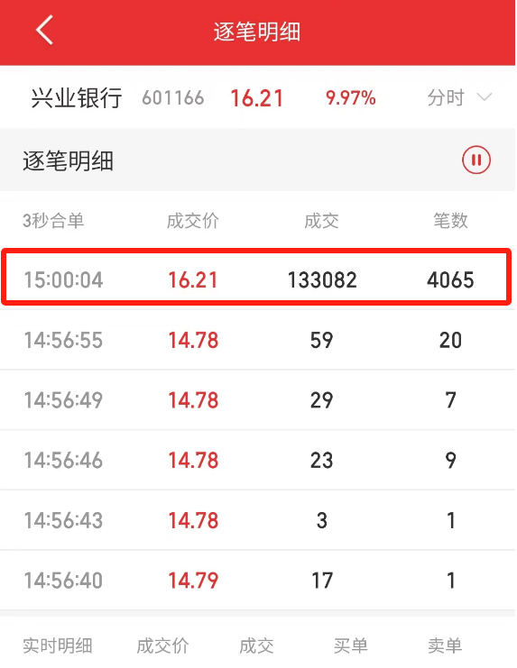 逐笔明细显示,兴业银行当天最后一分钟异动源于一批神秘大单的涌入,在16.21元的涨停价上共成交了约13.31万手,分4065笔买入,2.16亿成交额占到全日交易金额的28%。兴业银行经此次尾盘“偷袭”,市值瞬间暴增了将近300亿。