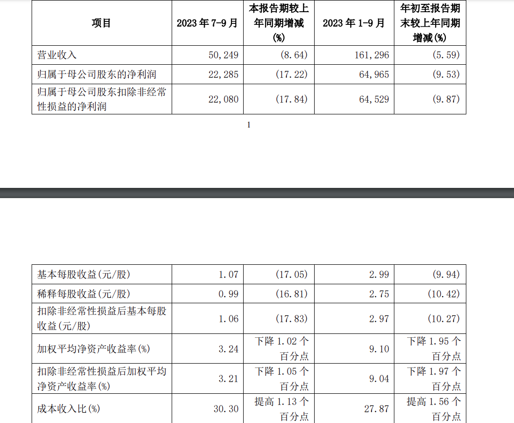 在费用控制方面,兴业银行也表现一般。三季度成本收入比30.30%,同比上升1.13个百分点。共同作用下该行三季度营收、净利润双双下滑。