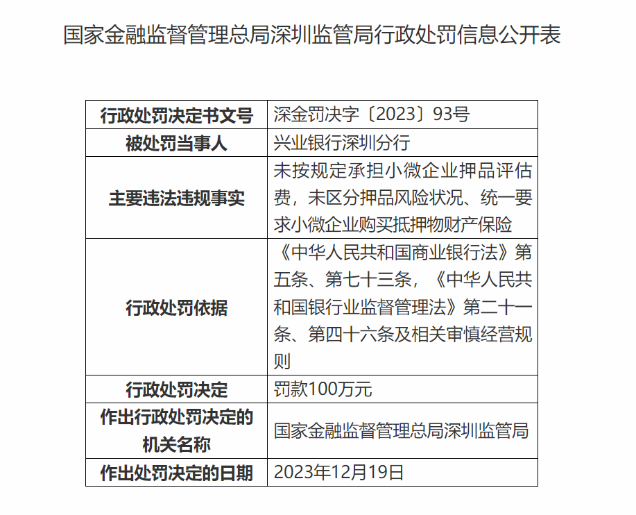 再看监管罚单方面,不完全统计显示,兴业银行及其分行2023年累计已被罚逾800万元。最近收到的罚单为兴业银行深圳分行因未按规定承担小微企业押品评估费等,被罚款100万元,作出处罚的日期为2023年12月19日。