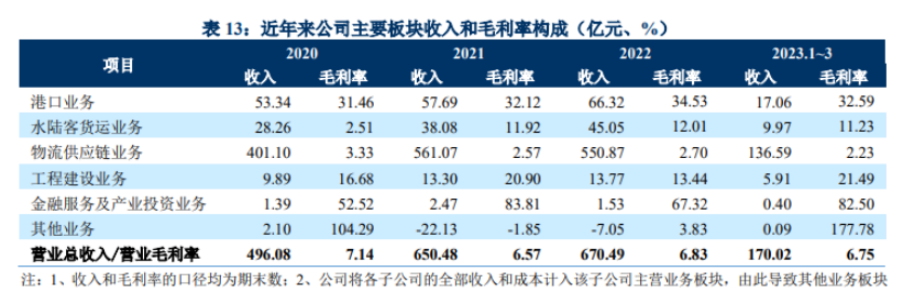 今年前三季度,福建港口集团实现营收480.25亿元。从福建港口集团的毛利结构与利润贡献来看,来自金融服务及产业投资业务收入虽不及主营业务零头,但过去三年,该项业务毛利率常年维持在53%至84%之间,去年一季度也高达83%,远远超过港口等主业毛利率。