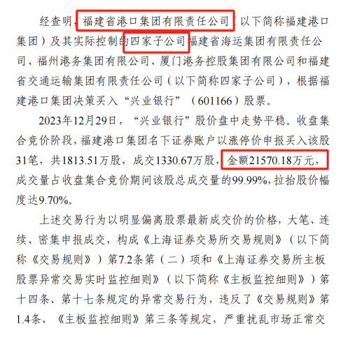 其中显示,2023年12月29日收盘集合竞价阶段,福建港口集团名下证券账户在交易兴业银行过程中,以明显偏离股票最新成交价的价格大笔申报成交,成交133082手,成交金额达2.157亿元,构成收盘集合竞价阶段拉抬股价的异常交易行为。