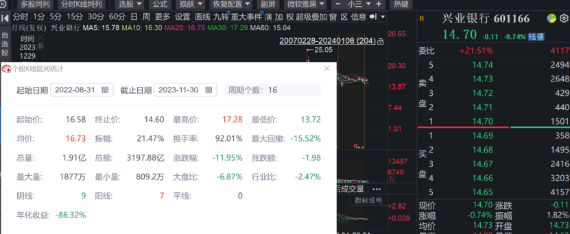 但如前所述,兴业银行股价已从9月末16.29元滑落至12月末的14.72元,跌幅近11%,亦给福建港口集团带来近8.77亿元的浮亏。