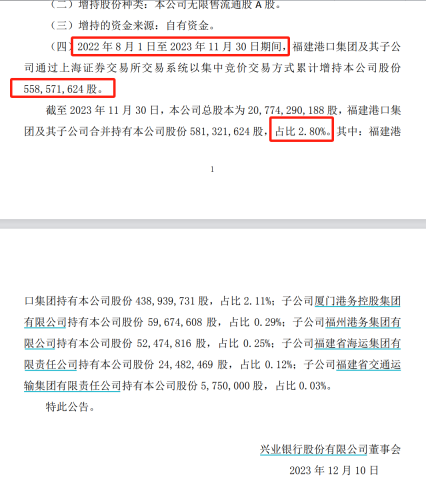 2022年8月1日至2023年11月30日期间,福建港口集团及其子公司累计增持5.59亿股公司股份,合计持股比例为2.80%。以增持期间均价16.73元计算,持仓价值或高达93.44亿元。