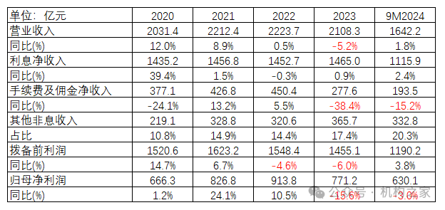 再看其他经营指标情况。作为剔除拨备影响因素后更实际的指标,该行拨备前利润早已在2022年转为下降,当年同比下降4.6%至1548.4亿,在2023年进一步下降6.0%至1455.1亿。收入端而言,其增速从2020年即开始下降,并逐渐转为负增长。期间增速分别为12.0%、8.9%、0.5%、-5.2%,对应收入2031.4亿、2212.4亿、2223.7亿和2108.3亿。