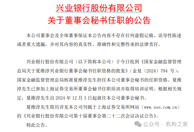 昨日,兴业银行公告收到《国家金融监督管理总局关于夏维淳兴业银行董事会秘书任职资格的批复》(金复〔2024〕794号),国家金融监督管理总局核准夏维淳担任本公司董事会秘书的任职资格。夏维淳已参加上海证券交易所董事会秘书任职培训并取得培训证明。根据相关规定,其自2024年12月3日起就任本公司董事会秘书。