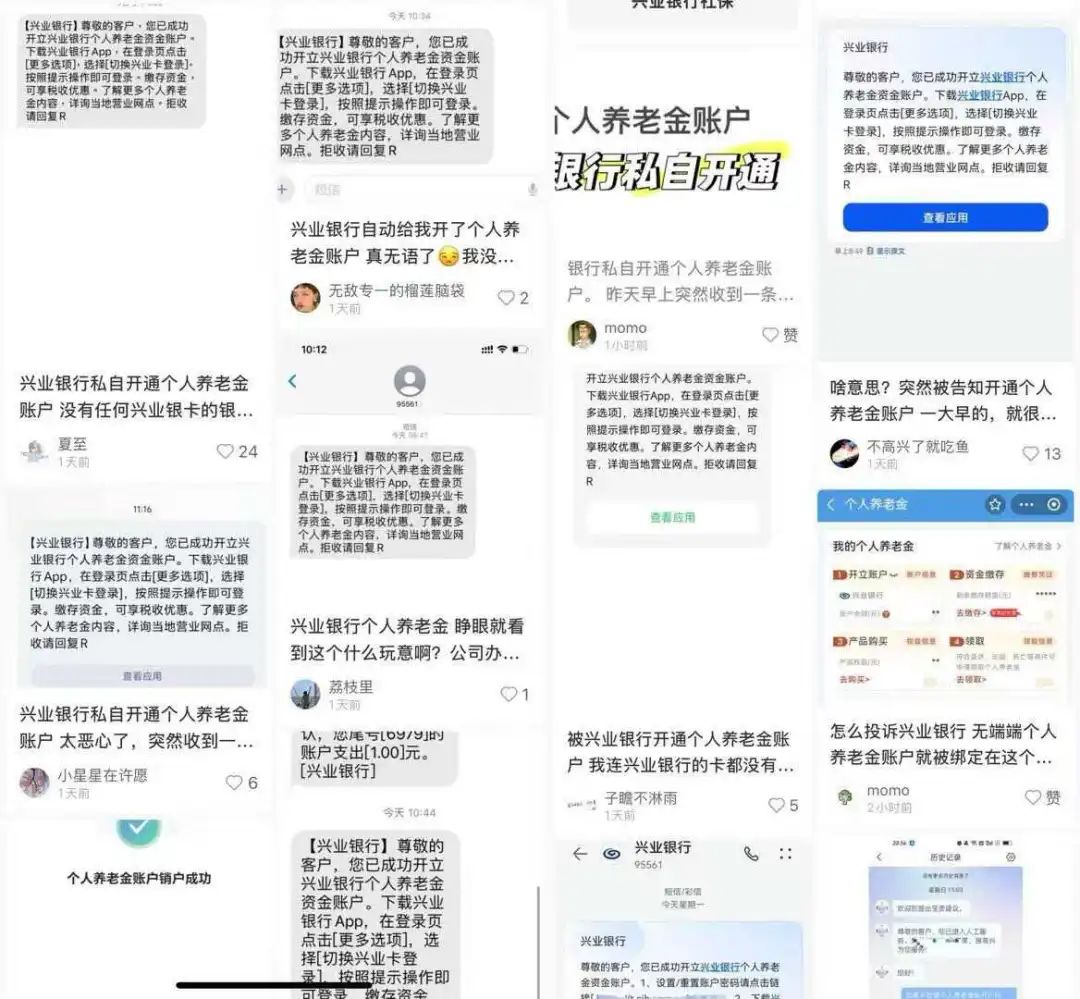 最近,各大社交平台上,涌现出不少网友反馈:突然收到兴业银行发来的短信通知,才知道自己竟然被兴业银行私自开通了个人养老金账户。