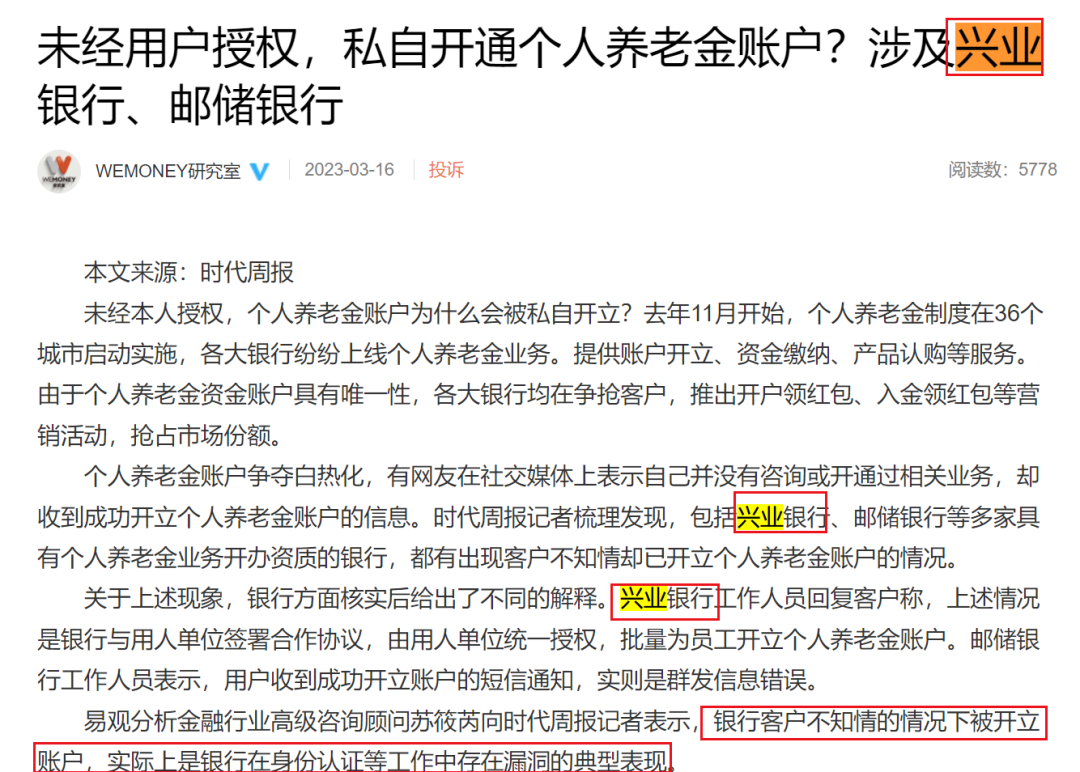 2023年年初,兴业银行就多次被媒体曝出未经用户授权,私自开通个人养老金账户的前科。
