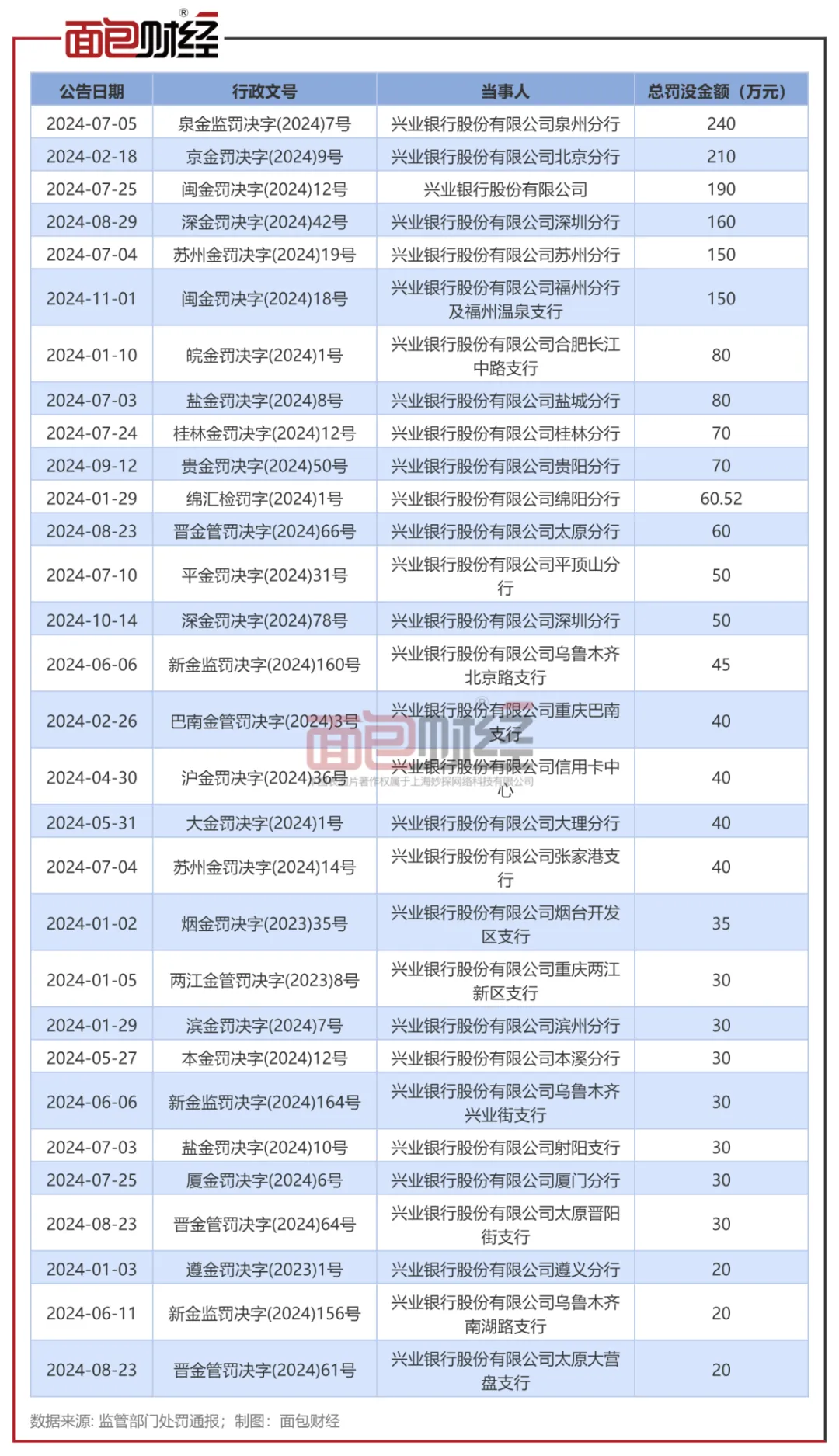 据面包财经统计,今年以来兴业银行多次被监管部门处罚,超100万元的大额罚单共计6张。