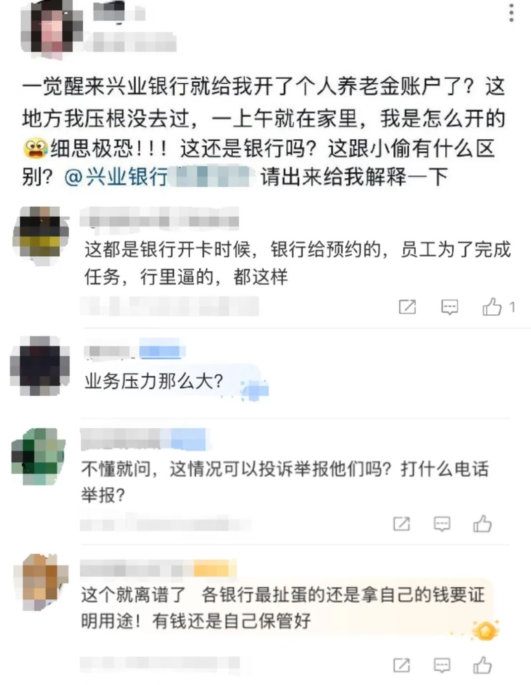 另外,还有不少网友在社交平台上吐槽表示:“一觉醒来兴业银行便给我开了该行个人养老金账户,一上午就在家里,我是怎么开的?”