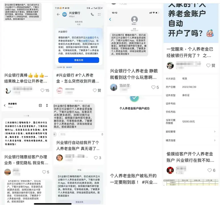 网友普遍表示,自己并没有预约,也没有被诱导点击办理的现象,而是什么都没做,莫名其妙就被开通了养老账户,其中还有多人表示是半夜开通的,自己睡醒才看到。有网友评论说,自己名下没有兴业银行的卡,也被开通了账户。
