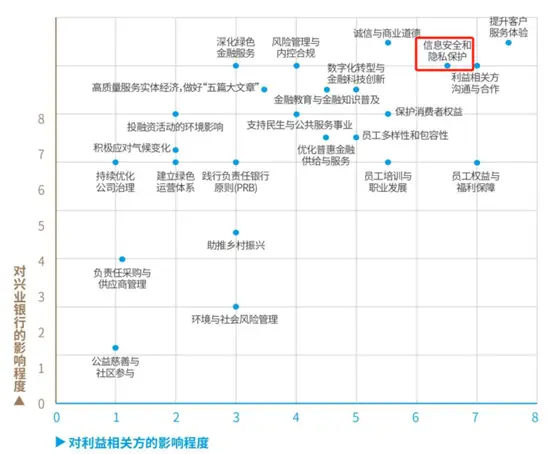 据兴业银行2023年年度可持续发展报告,“信息安全和隐私保护”议题被列在双重重要性矩阵的右上角,即对兴业银行和利益相关方均非常重要。