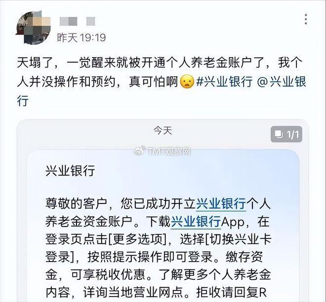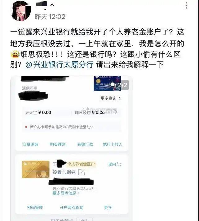 据悉,多位网友在社交媒体平台反映称,在毫不知情、未授意的情况下,被兴业银行开通了个人养老金资金账户,且注销过程繁琐,给用户带来极大不便。这一现象并非个例,而是涉及众多用户,甚至包括一些从未与兴业银行有过接触的人。这些用户不仅对自己的账户被开通感到愤怒,更担忧自己的个人信息和资金安全。