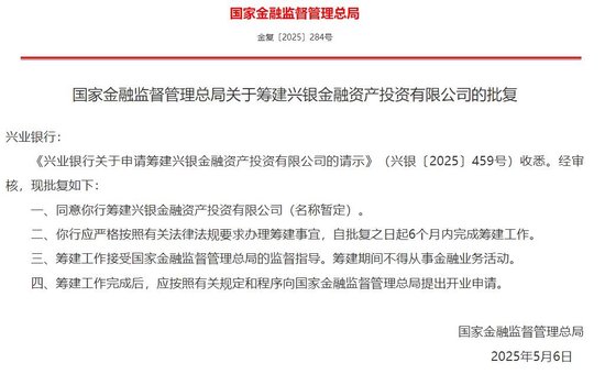 5月7日晚间,兴业银行(601166.SH)公告,收到《国家金融监督管理总局关于筹建兴银金融资产投资有限公司的批复》(金复〔2025〕284 号)。