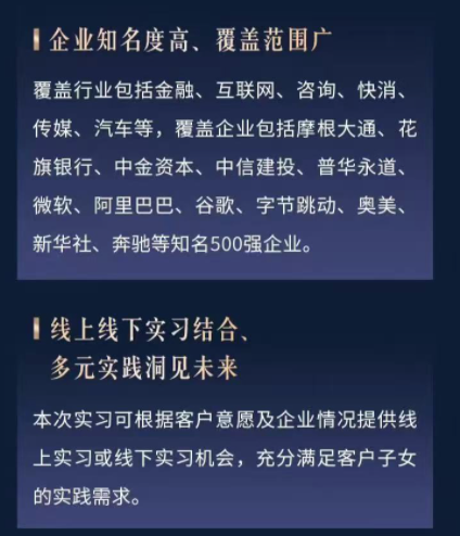2023年,兴业银行私人银行将相关服务升级为“菁英教育”服务体系。在该体系下,推出了“菁英实习计划”,为高净值客户子女提供包括线下实习和远程实习在内的优质企业实习机会。该私行员工曾表示,该项目的核心优势在于为参与者提供多家知名企业的线上与线下实习机会,完成实习的参与者还将获得实习证明,这将有效提升客户子女在留学申请或求职过程中的竞争力,属于高净值客户子女教育体系中的一环。