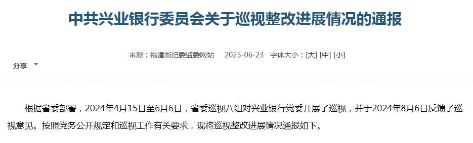 据福建纪委,根据省委部署,2024年4月15日至6月6日,省委巡视八组对兴业银行党委开展了巡视,并于2024年8月6日反馈了巡视意见。