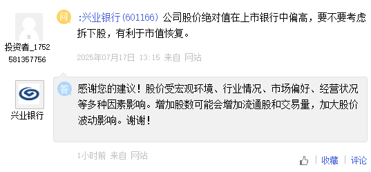 7月22日金融一线消息,有投资者向兴业银行建议拆股以促进市值恢复。对此,兴业银行回应称,股价受宏观环境、行业情况、市场偏好、经营状况等多种因素影响。增加股数可能会增加流通股和交易量,加大股价波动影响。