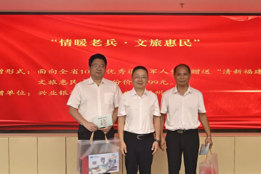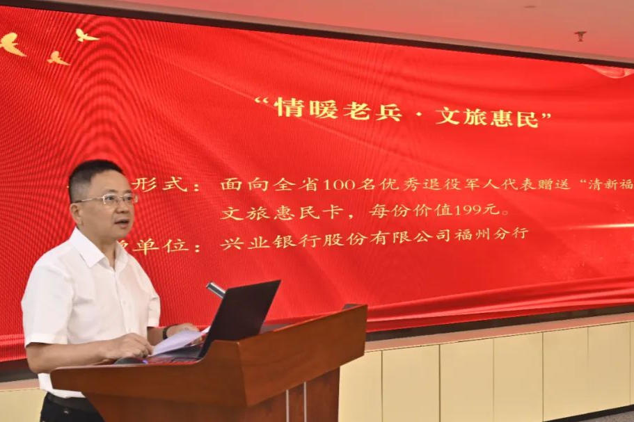 8月5日下午,2025年“情暖老兵”系列活动在福州启动。兴业银行福州分行党委书记、行长王良杰代表福州分行向福建省100名优秀退役军人代表赠送“清新福建”文旅惠民卡并致辞。