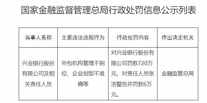 金融监管总局近日公布的一则行政处罚决定引发市场关注: 兴业银行 股份有限公司因外包机构管理失当、企业划型有误等问题,被处以720万元罚款,相关责任人员张浩同时被警告并罚款6万元。这一处罚暴露出部分金融机构在合规经营与精细化管理方面仍存在短板,也为行业敲响警钟。