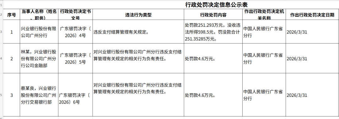 近日,中国人民银行广东省分行公示了一则行政处罚信息:兴业银行广州分行因违反支付结算管理有关规定,被处以罚款251.293万元,同时没收违法所得598.5元,合计罚没251.35285万元。