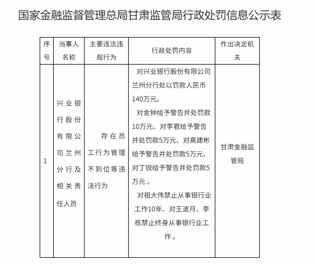 2月2日,因存在员工行为管理不到位等违法行为,甘肃金融监管局对兴业银行兰州分行处以罚款140万元。