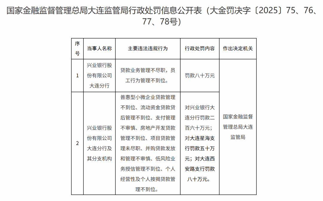 1月9日,因普惠型小微企业贷款管理不到位、流动资金贷款贷后管理不到位、支付管理不审慎、房地产开发贷款管理不到位、项目贷款管理未尽职、并购贷款发放和管理不审慎、低风险业务授信管理不到位、个人经营性及个人按揭贷款管理不到位主要违法违规行为,兴业银行大连分行被罚款260万元。