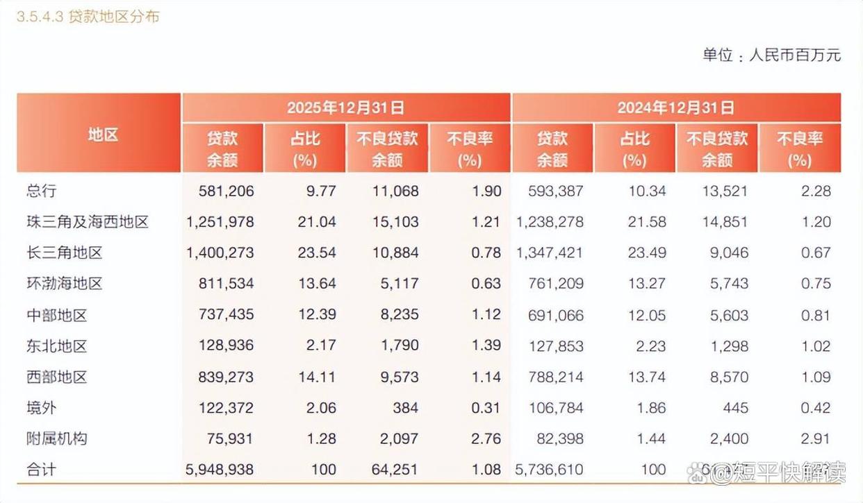 据短平快解读了解,不良贷款率在1%以上的地区包括总行、珠三角及海西地区、中部地区、东北地区、西部地区、附属机构,除去前两大地区,其余地区分别为1.12%、1.39%、1.14%、2.76%,前三大地区同比分别增加0.31个百分点、0.37个百分点、0.05个百分点,附属机构同比下滑0.15个百分点。