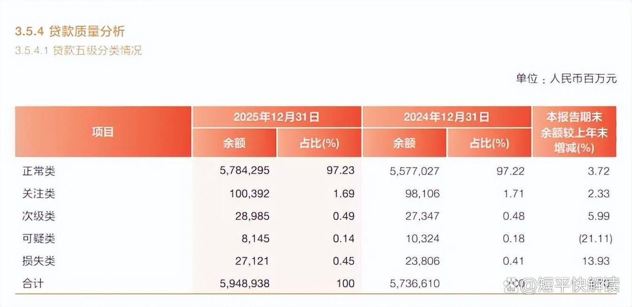 按五级分类来看,2025年关注类贷款、次级类、损失类均有所增加,分别为1003.92亿元、289.85亿元、271.21亿元,同比分别增加22.86亿元、16.38亿元、33.15亿元,可疑类贷款为81.45亿元,同比减少21.79亿元。